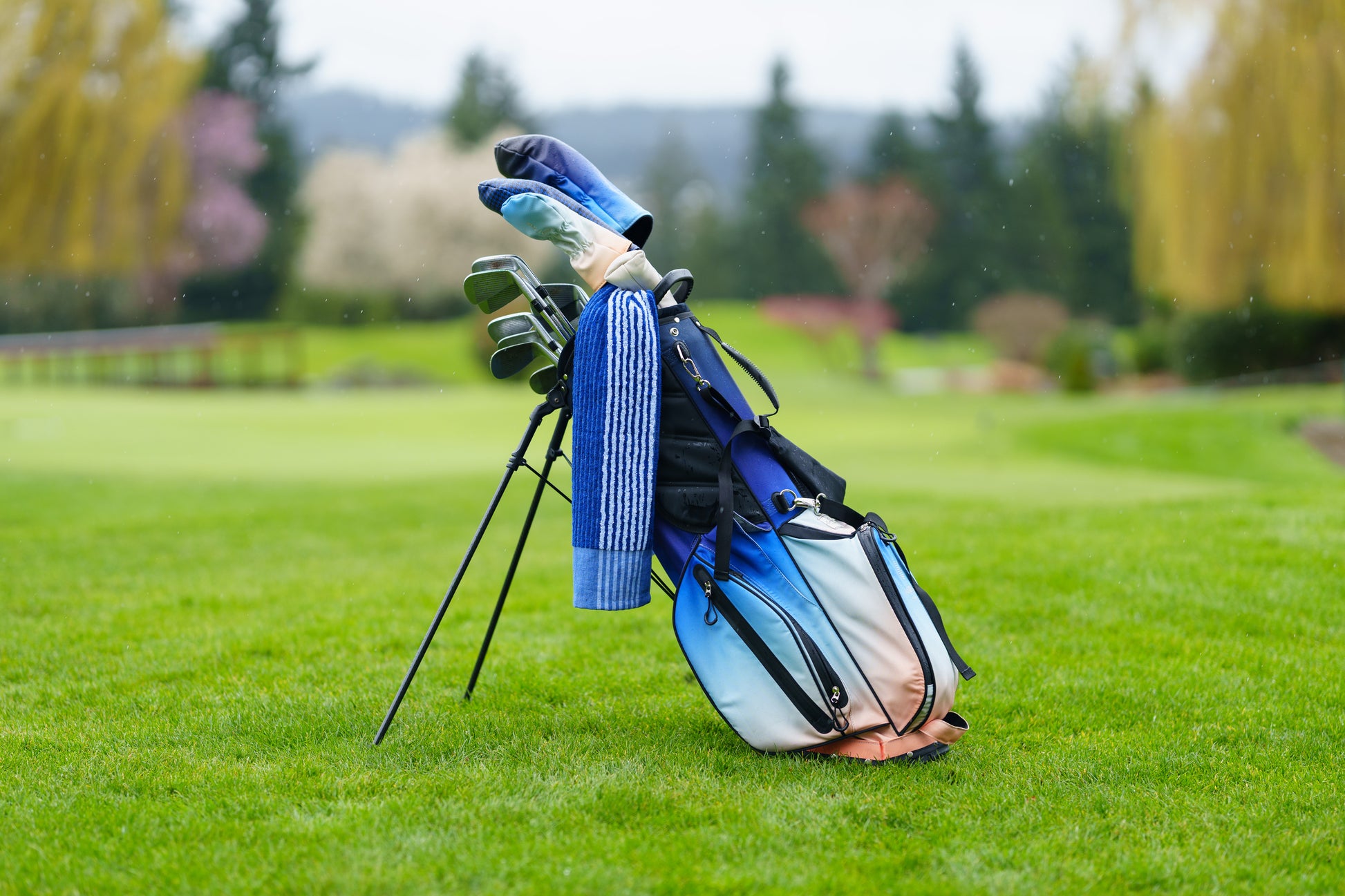 Collection includes golf bag; matching removable valuables cross body bag, three headcovers and towel.